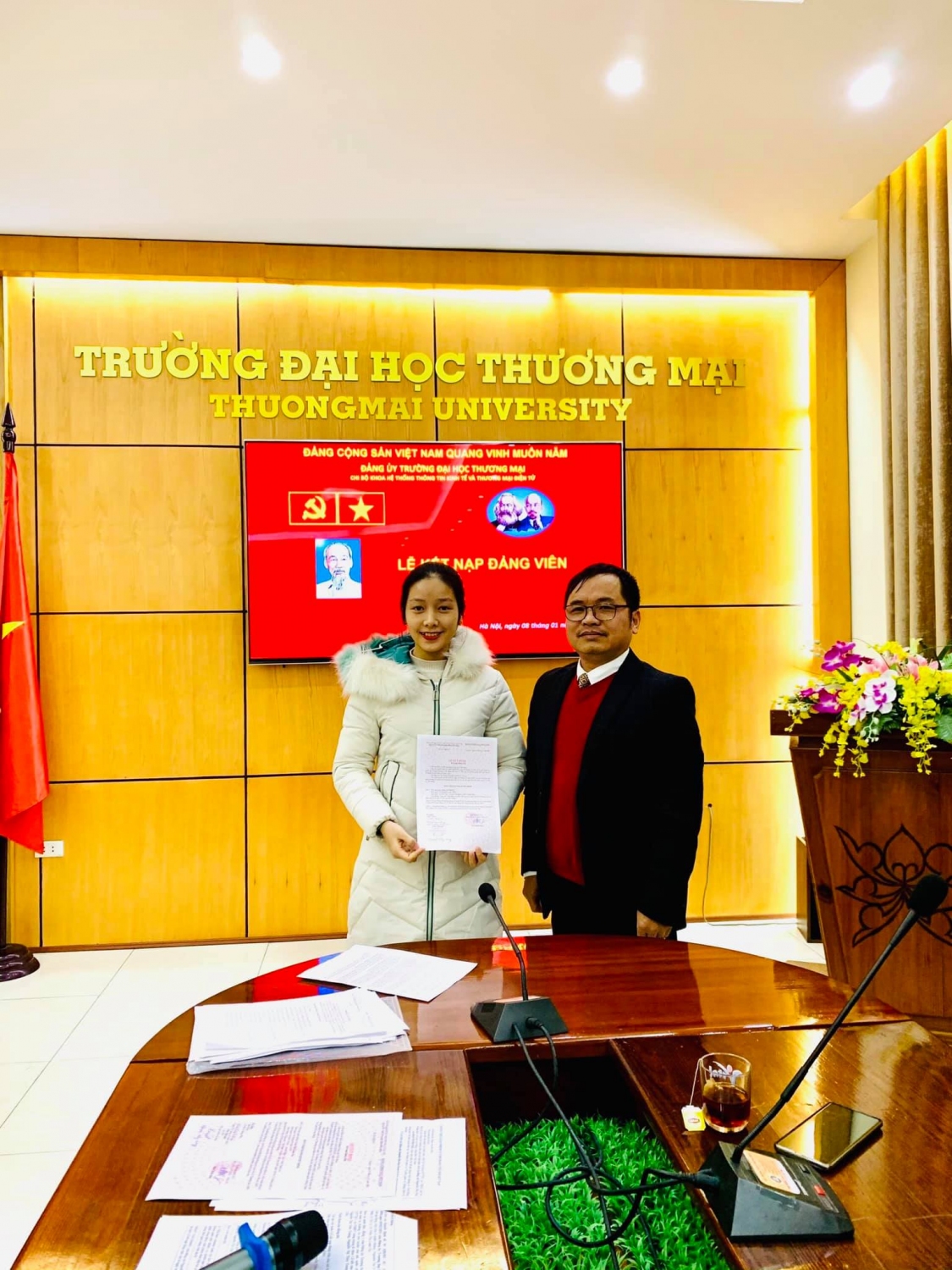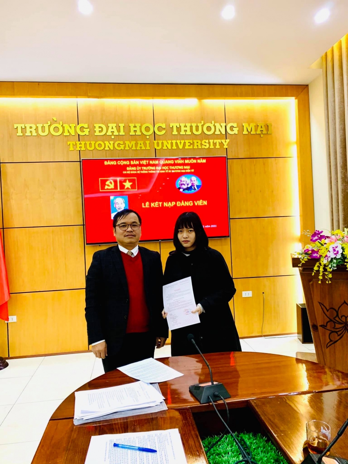 Sáng nay, Ngày 8/1 tại phòng họp số 1 nhà I, được sự đồng ý của Đảng uỷ Trường ĐH Thương mại, Chi bộ Khoa HTTT Kinh tế và TMĐT đã tổ chức Lễ kết nạp Đảng cho các quần chúng: