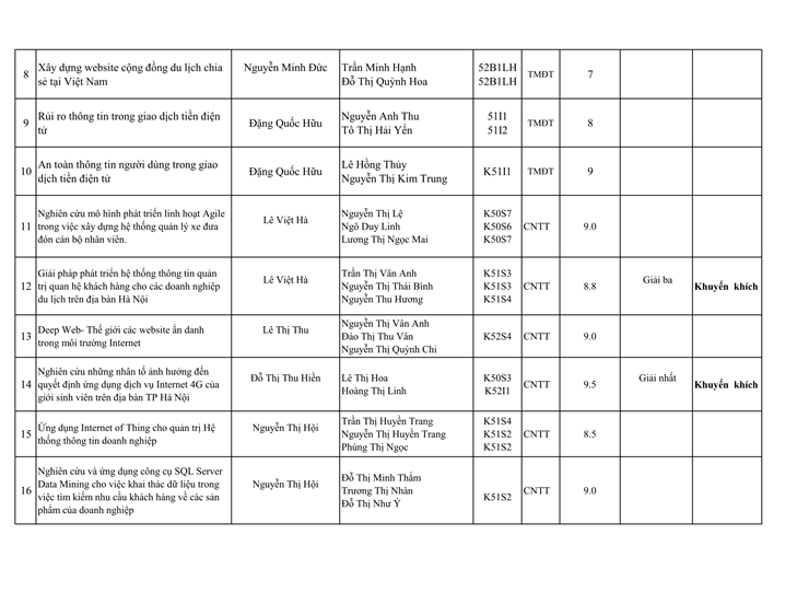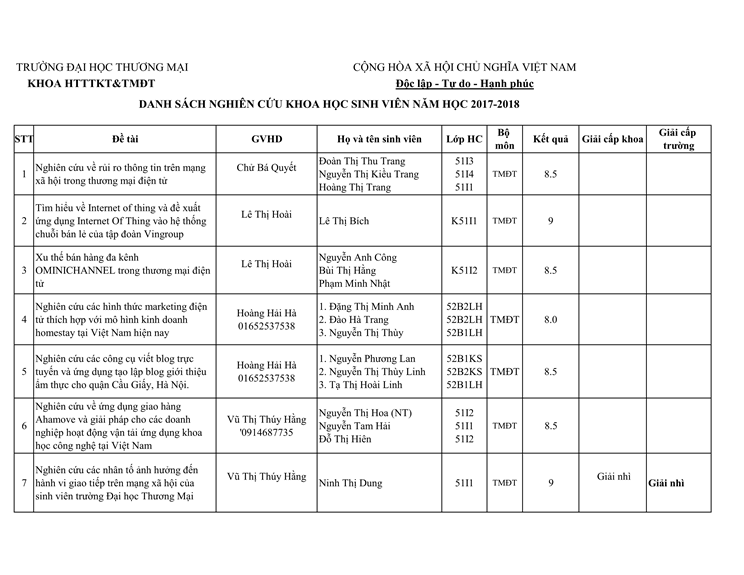 Năm học 2017 - 2018, cả 2 ngành là ngành TMĐT và ngành HTTT Kinh tế có 21 đề tài NCKH sinh viên. Các đề tài sau đã vinh dự đạt giải các cấp:
