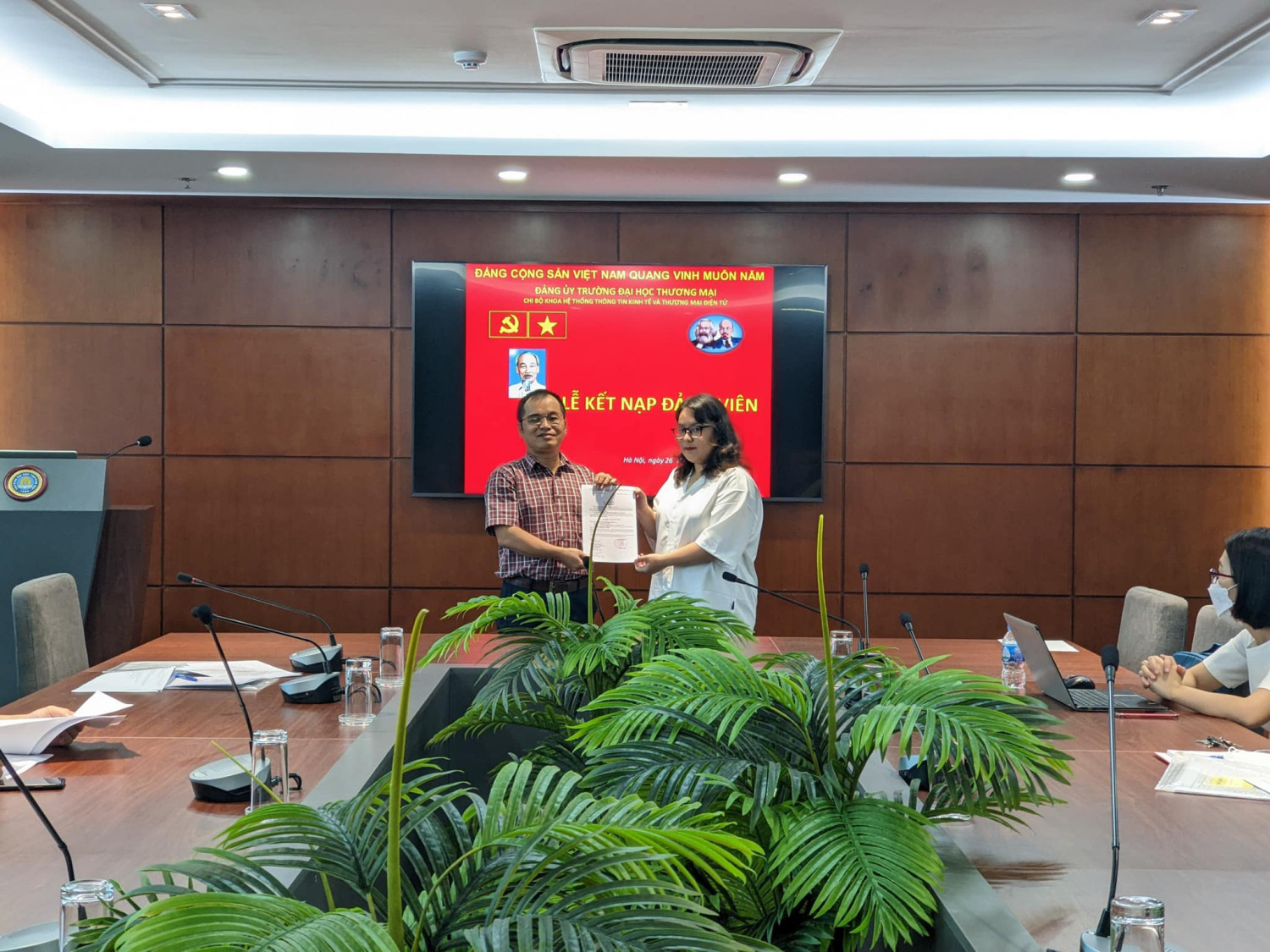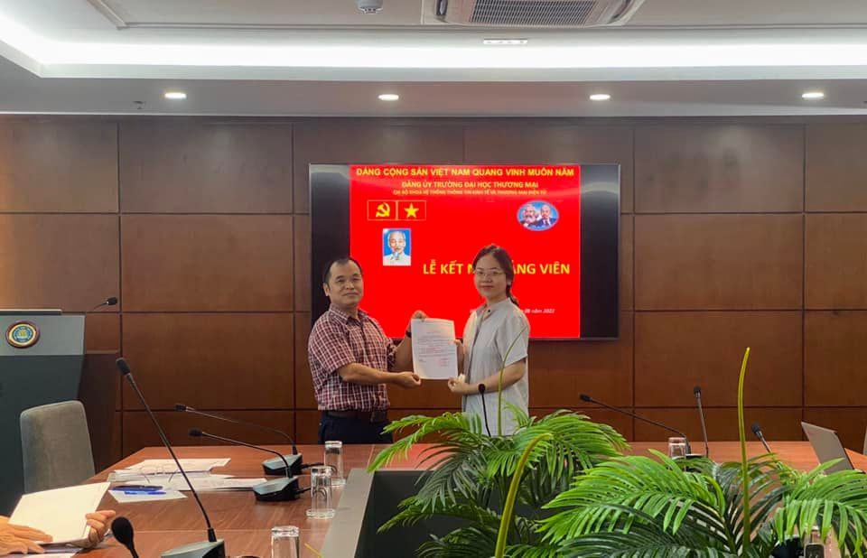 Được sự đồng ý của Đảng uỷ trường Đại học Thương mại, sáng ngày 26/08/2022, tại Phòng khánh tiết nhà F, Chi bộ Khoa HTTT Kinh tế và TMĐT đã tổ chức Lễ kết nạp Đảng cho các quần chúng: 1. Lê Phương Thuý - Sinh viên lớp K55S1 - Khoa HTTT Kinh tế và TMĐT - Trường Đại học Thương mại 2. Nguyễn Ngọc Minh Châu- Sinh viên lớp K55S2 - Khoa HTTT Kinh tế và TMĐT - Trường Đại học Thương mại Sau khi tuyên thệ, Chi bộ phân công các đ/c Đảng viên: Đ/c Nguyễn Thị Hội giúp đỡ đ/c Lê Phương Thuý , Đ/c Nguyễn Thị Hiền giúp đỡ đ/c Nguyễn Ngọc Minh Châu. Chúc mừng hai đồng chí đã được đứng trong hàng ngũ Đảng viên Đảng cộng sản Việt Nam. Chúc cho các đồng chí Đảng viên mới luôn: Thực hiện tốt những nhiệm vụ của Đảng viên ở Điều 2 của Điều lệ Đảng Cộng sản Việt Nam Phát huy những quyền hạn theo QĐ trong Điều 3 của Điều lệ Đảng Cộng sản Việt Nam Tiếp tục rèn luyện, phấn đấu trong học tập, nghiên cứu khoa học và hoạt động phong trào, đoàn thể của Khoa HTTT Kinh tế và TMĐT. Sau khi lễ kết nạp đảng, Đồng chí Nguyễn Hưng Long- Bí thư chi bộ Khoa Hệ thống TTKT & TMĐT trao quyết định công nhận Đảng viên chính thức cho 4 đồng chí: 1. Đ/c Đào Thị Lý K54I1 2. Đ/c Trần Thị Linh Chi K53I4 3. Đ/c Lê Hương Giang K53S2 4. Đ/c Nguyễn Thị Thuỳ Trang K53S4 Chúc mừng 4 đồng chí đã trở thành đảng viên chính thức và mong rằng các đồng chí sẽ phát huy năng lực tối đa trong các hoạt động xứng đáng với vai trò của người Đảng viên trẻ! Một số hình ảnh trong buổi lễ: