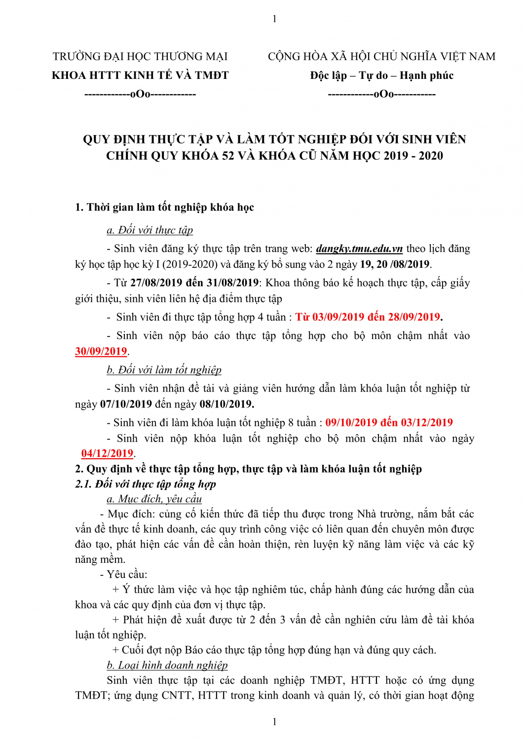 QUY ĐỊNH THỰC TẬP VÀ LÀM TỐT NGHIỆP ĐỐI VỚI SINH VIÊN CHÍNH QUY KHÓA 52 VÀ KHÓA CŨ NĂM HỌC 2019 - 2020