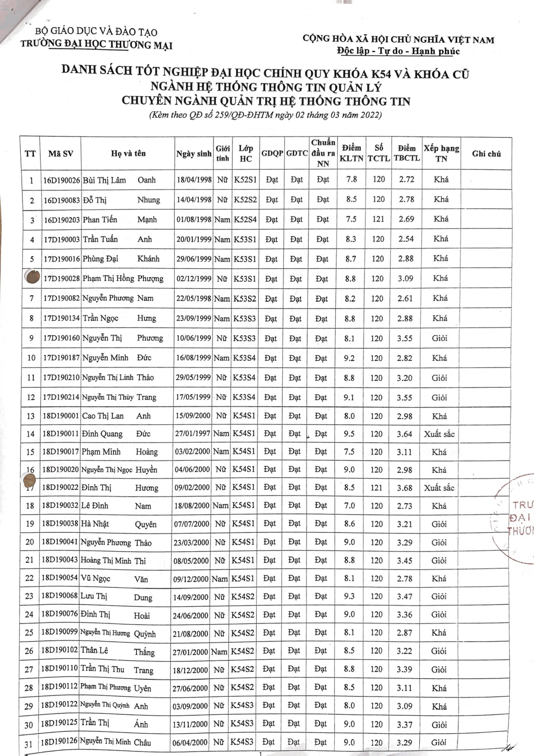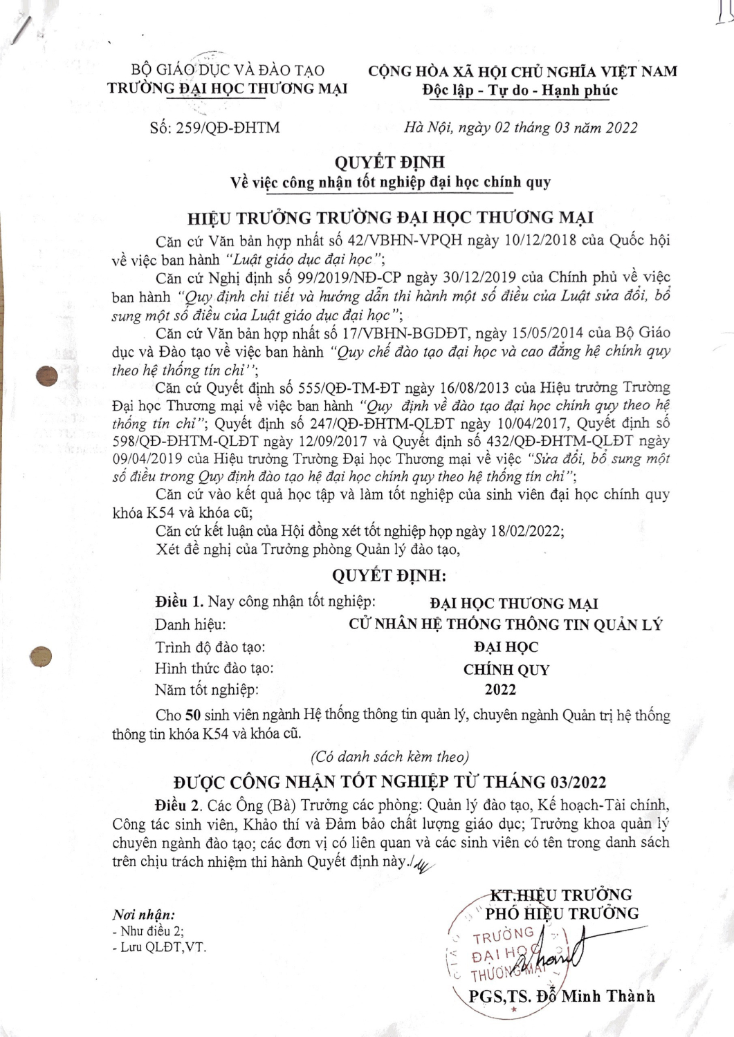 Quyết định 259/QĐ-ĐHTM của Đại học Thương mại ngày 02 tháng 03 năm 2022 về việc công nhận tốt nghiệp đại học chính quy cho 50 sinh viên chuyên ngành Quản trị hệ thống thông tin khóa 54 và Khóa cũ.
