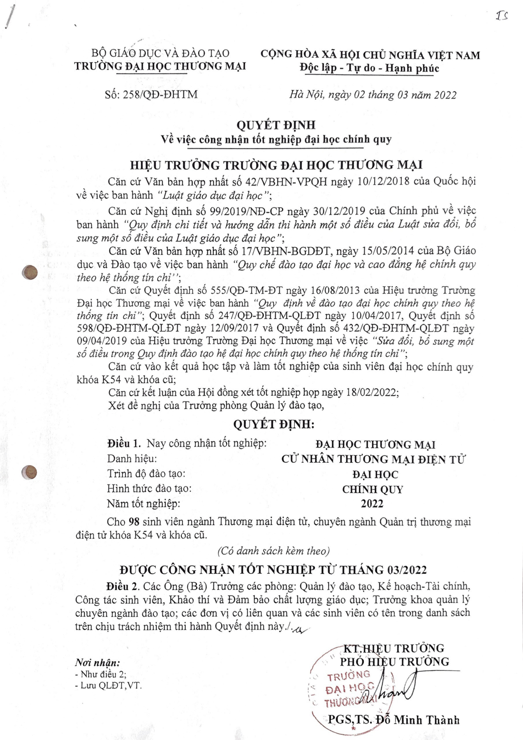 Quyết định 258/QĐ-ĐHTM của Đại học Thương mại ngày 02 tháng 03 năm 2022 về việc công nhận tốt nghiệp đại học chính quy cho 98 sinh viên chuyên ngành Quản trị Thương mại điện tử khóa 54 và Khóa cũ.