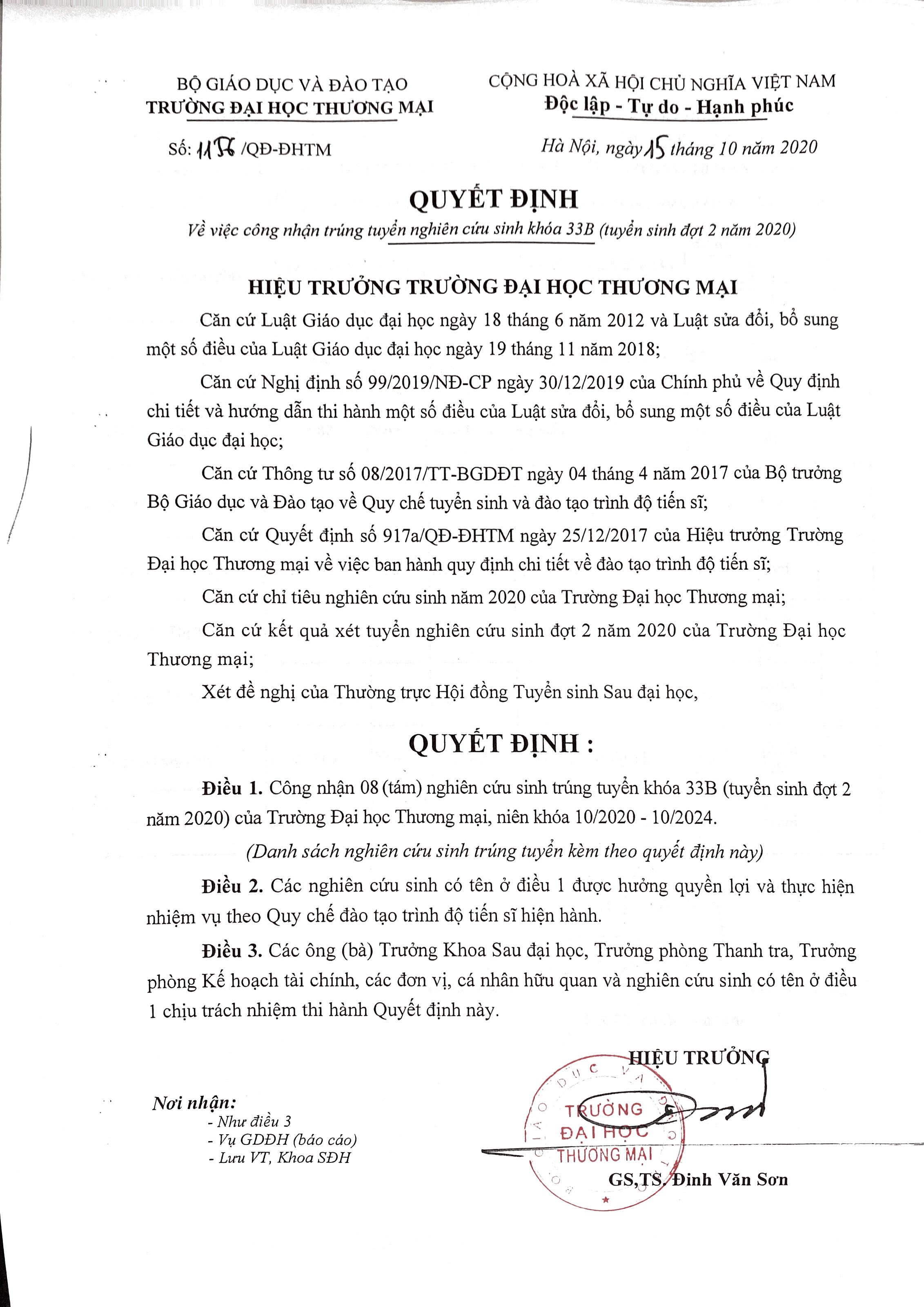 Quyết định công nhận trúng tuyển nghiên cứu sinh khóa 33B (tuyển sinh đợt tháng 10, năm 2020)