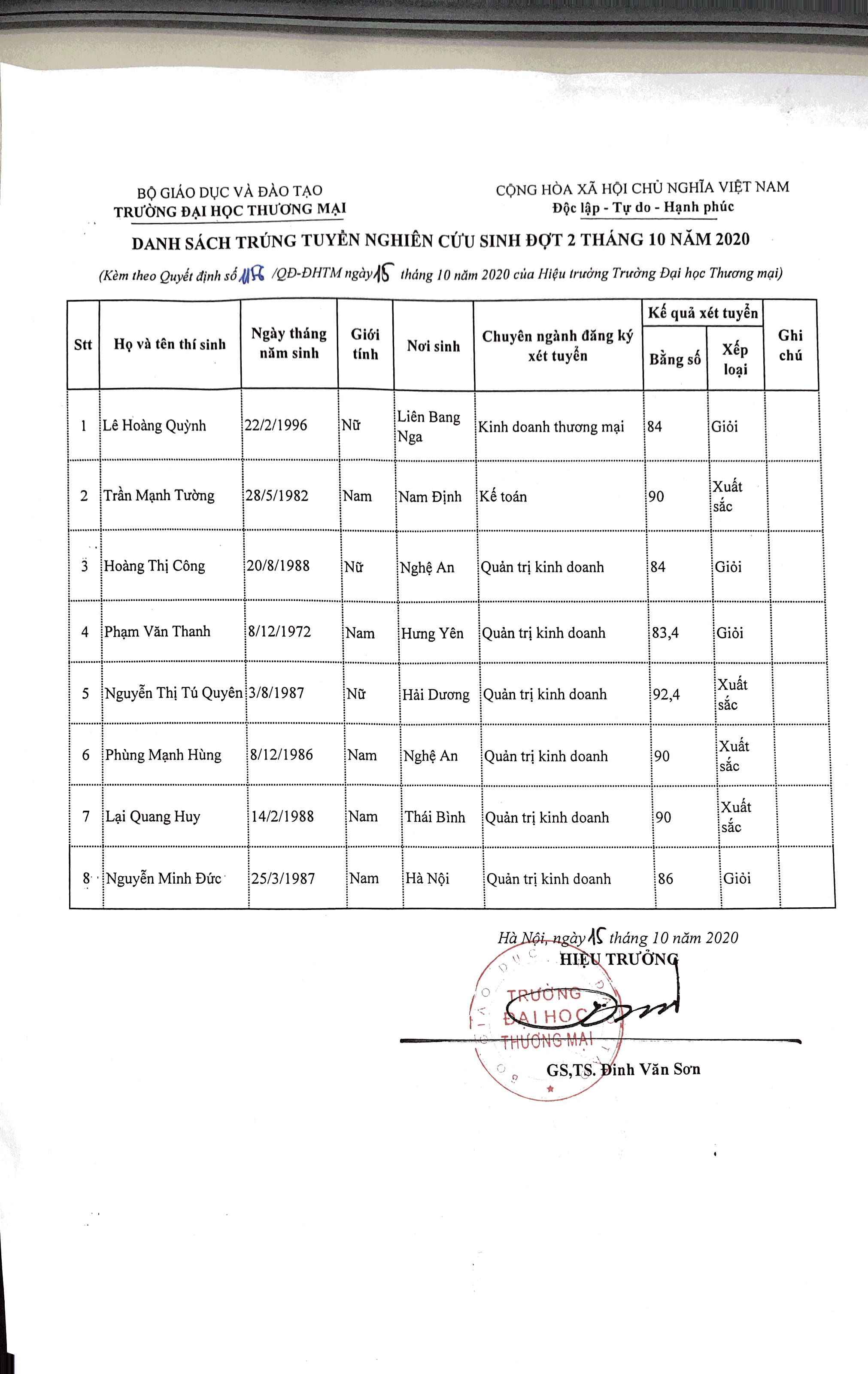 Quyết định trúng tuyển NCS tháng 10.2020