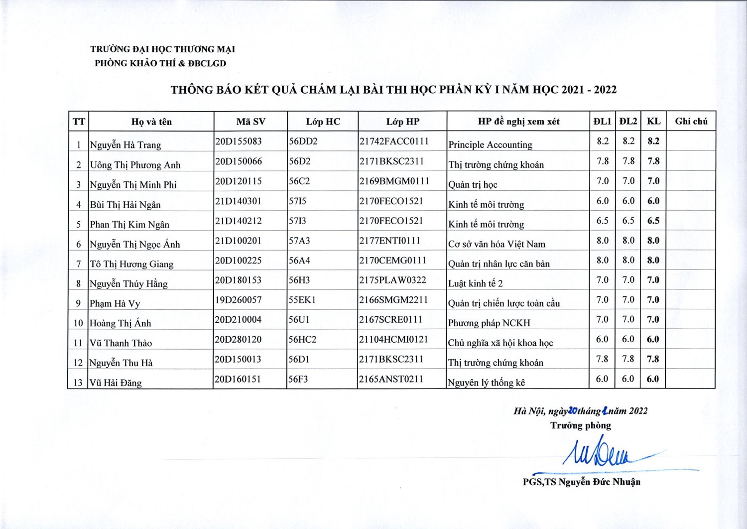Thông báo kết quả chấm lại bài thi học phần kỳ II năm học 2021-2022 (L10 )