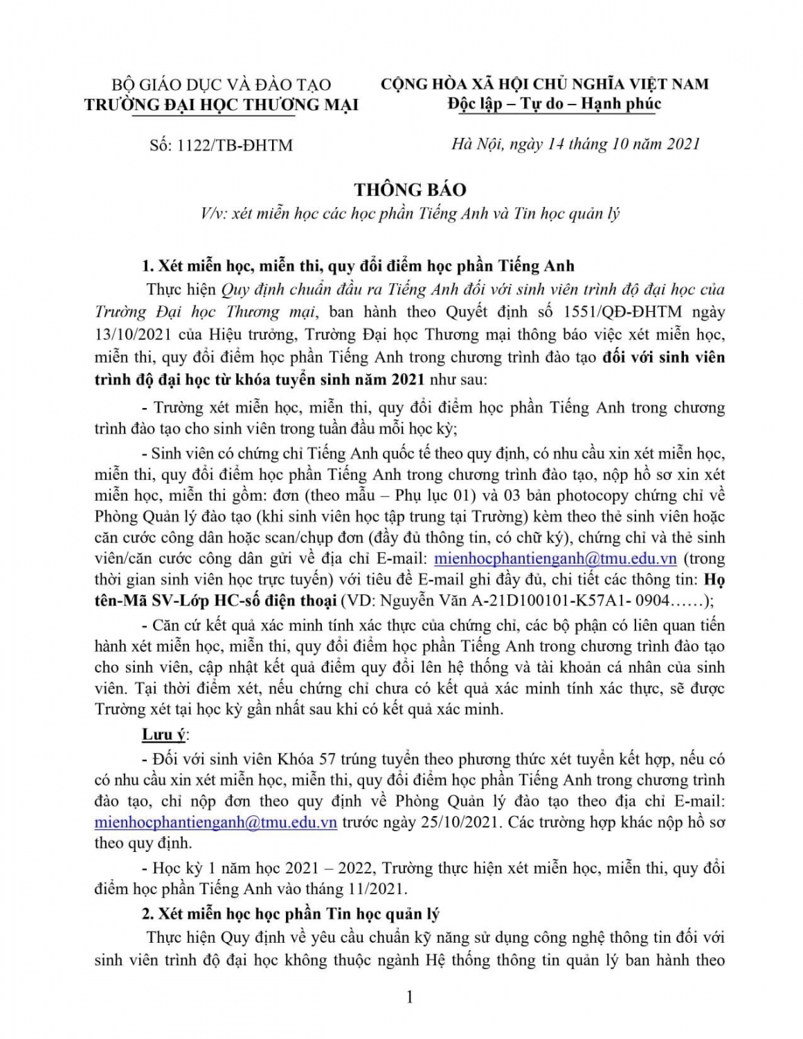 Thông báo quy định về việc xét miễn học, miễn thi, quy đổi điểm học phần tiếng Anh và miễn học học phần Tin học quản lý trong chương trình đào tạo đối với sinh viên trình độ đại học từ khóa tuyển sinh năm 2021, như sau: